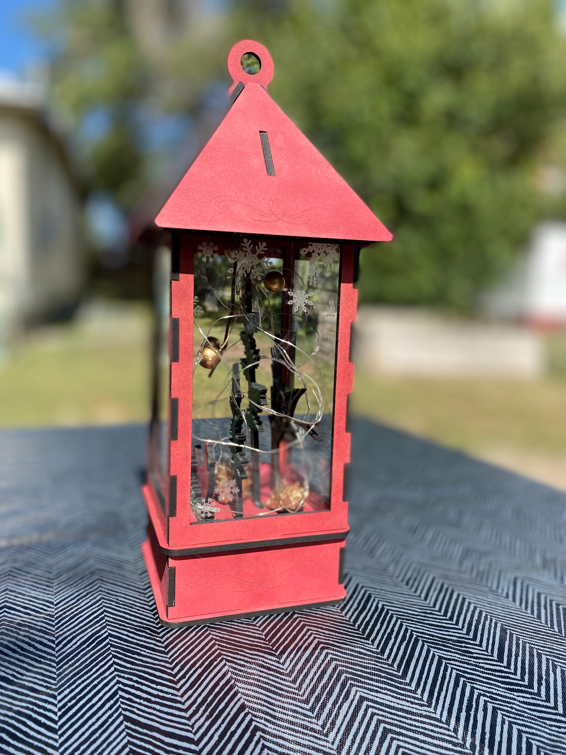 This lantern is laser cut from USA sourced MDF and Acrylic, with neat little snowflakes engraved onto the acrylic window panes. It is hand airbrushed to an old style Christmas red, and purposely painted to give light and dark areas to give a weathered, antique look.