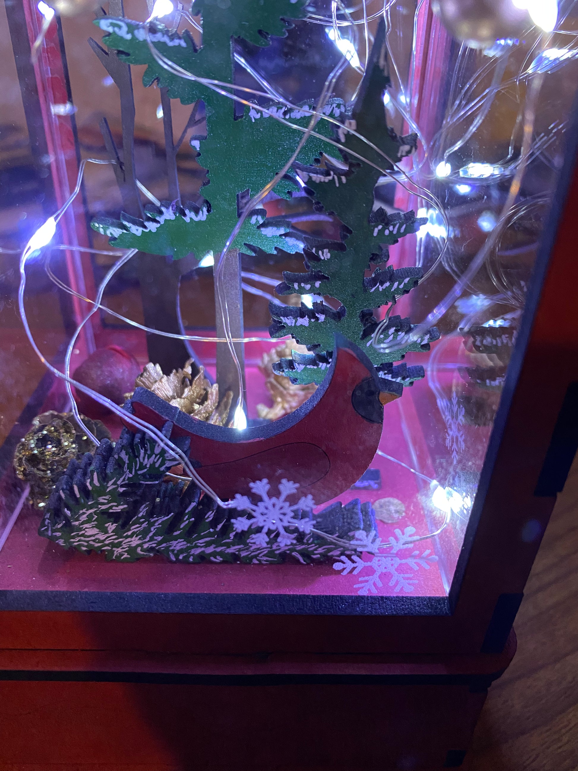 Inside is a Cardinal, trees and bushes that are all hand painted using acrylic paints and pens. Miniature pine cones and other decorations are affixed around the "ground" to complete the outdoor scene, captured in a lantern.