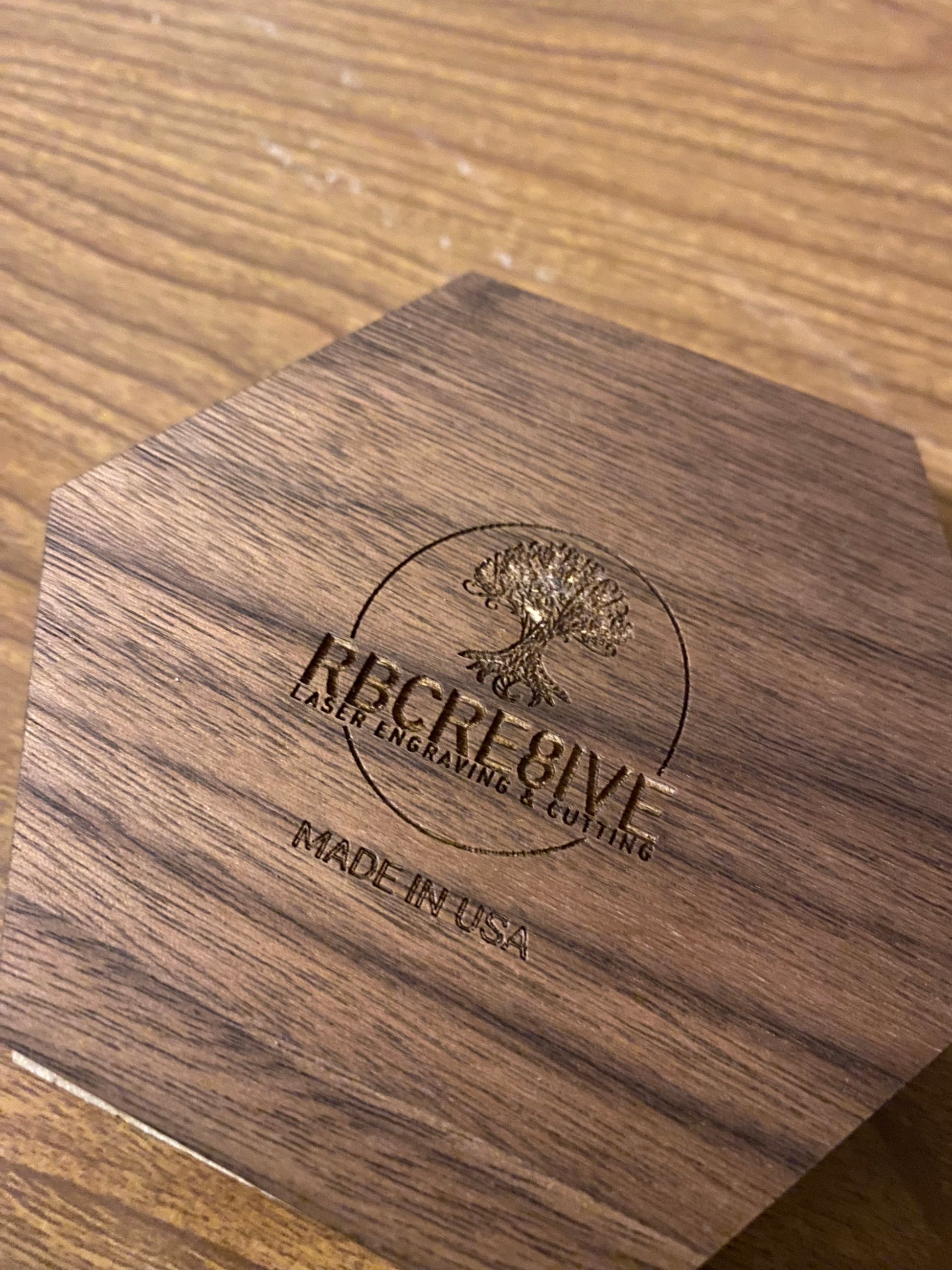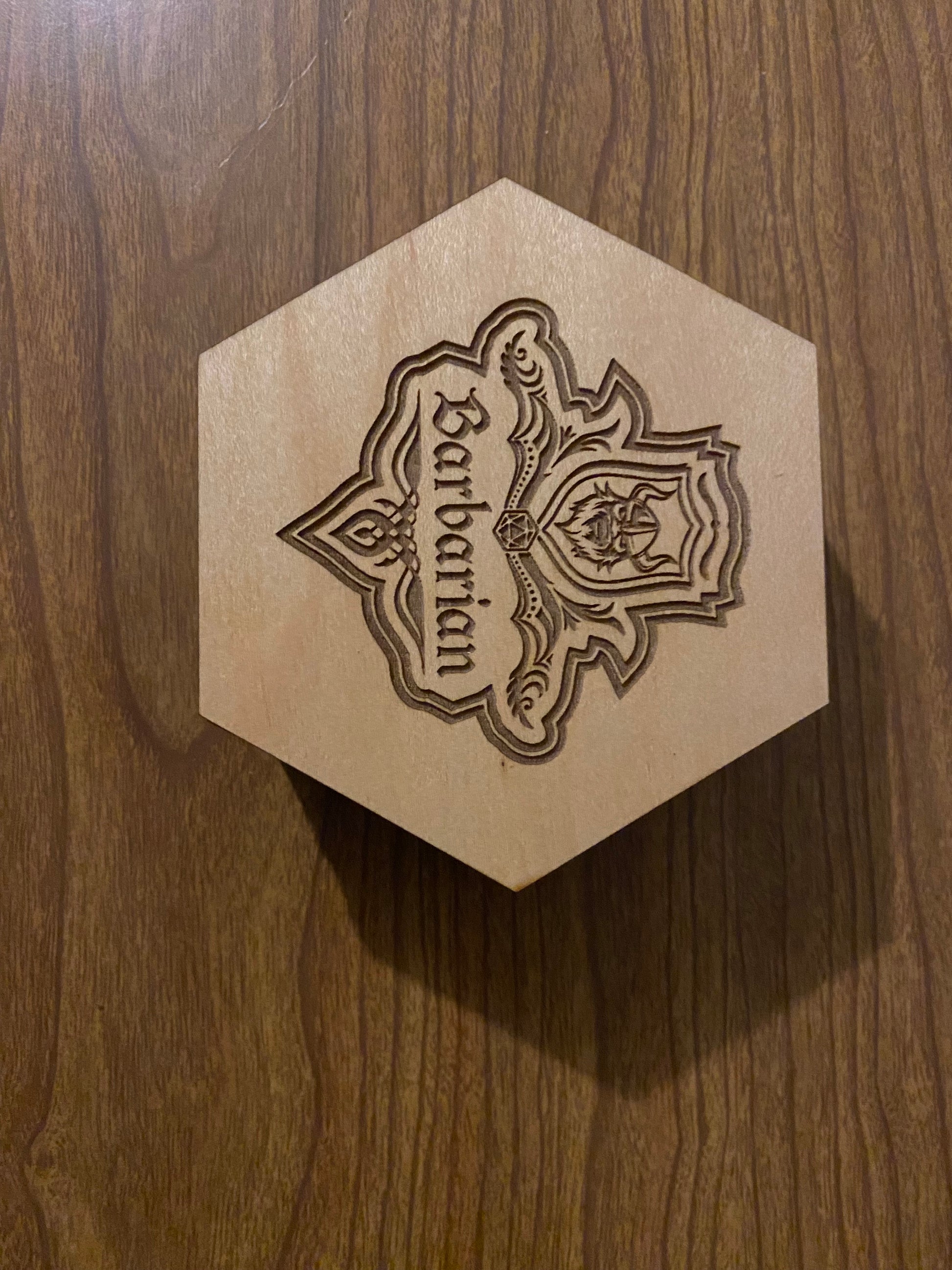 Made from USA sourced and manufactured hardwood veneered MDF, the boxes are laser cut and engraved before being hand glued layer by layer in our Colorado based laser lab. We are happy to offer several species of wood to choose from, have some base artwork we can use (mostly RPG class art as pictured) and are happy to include a player name, character name or other short phrase free of charge.