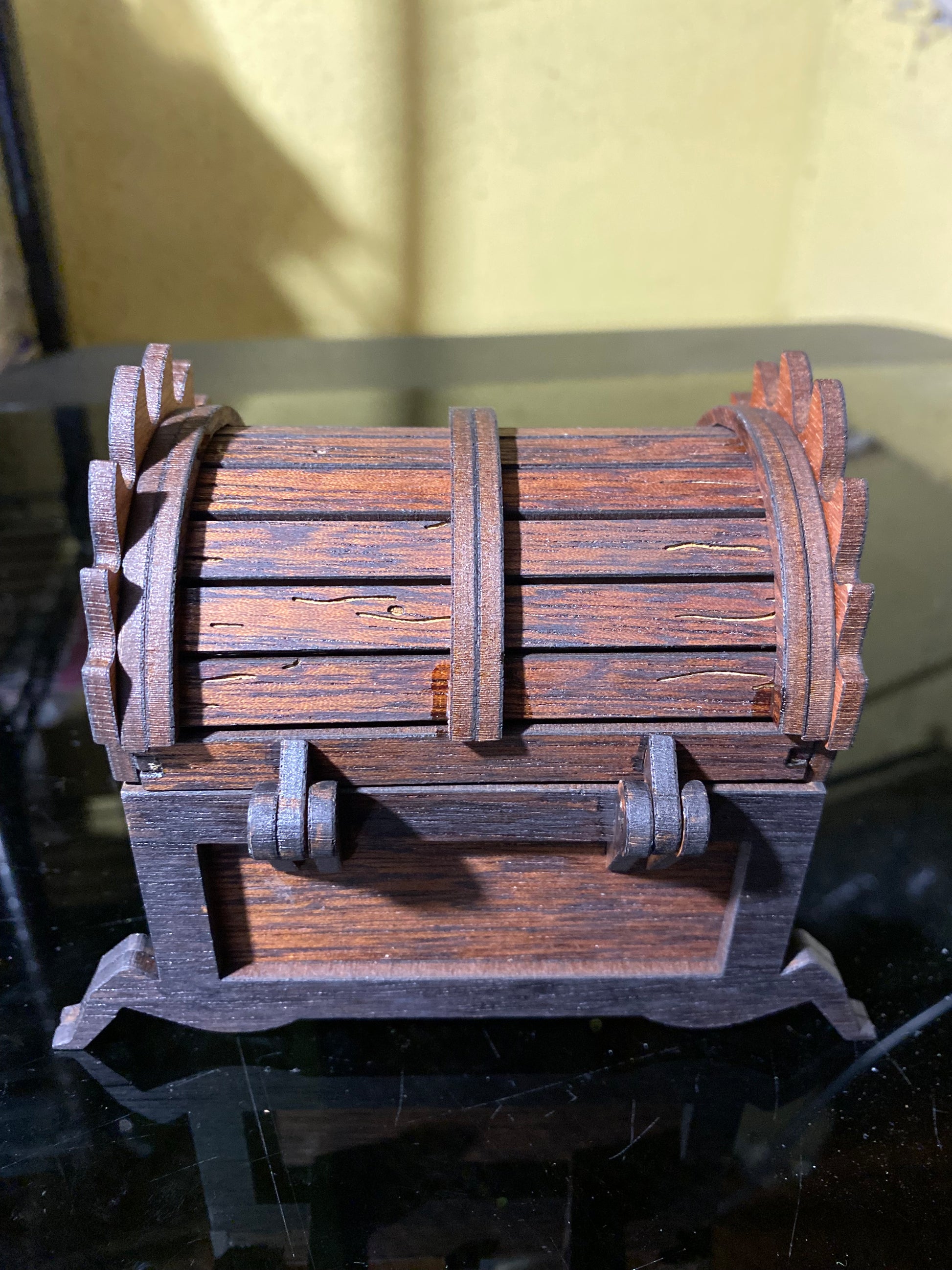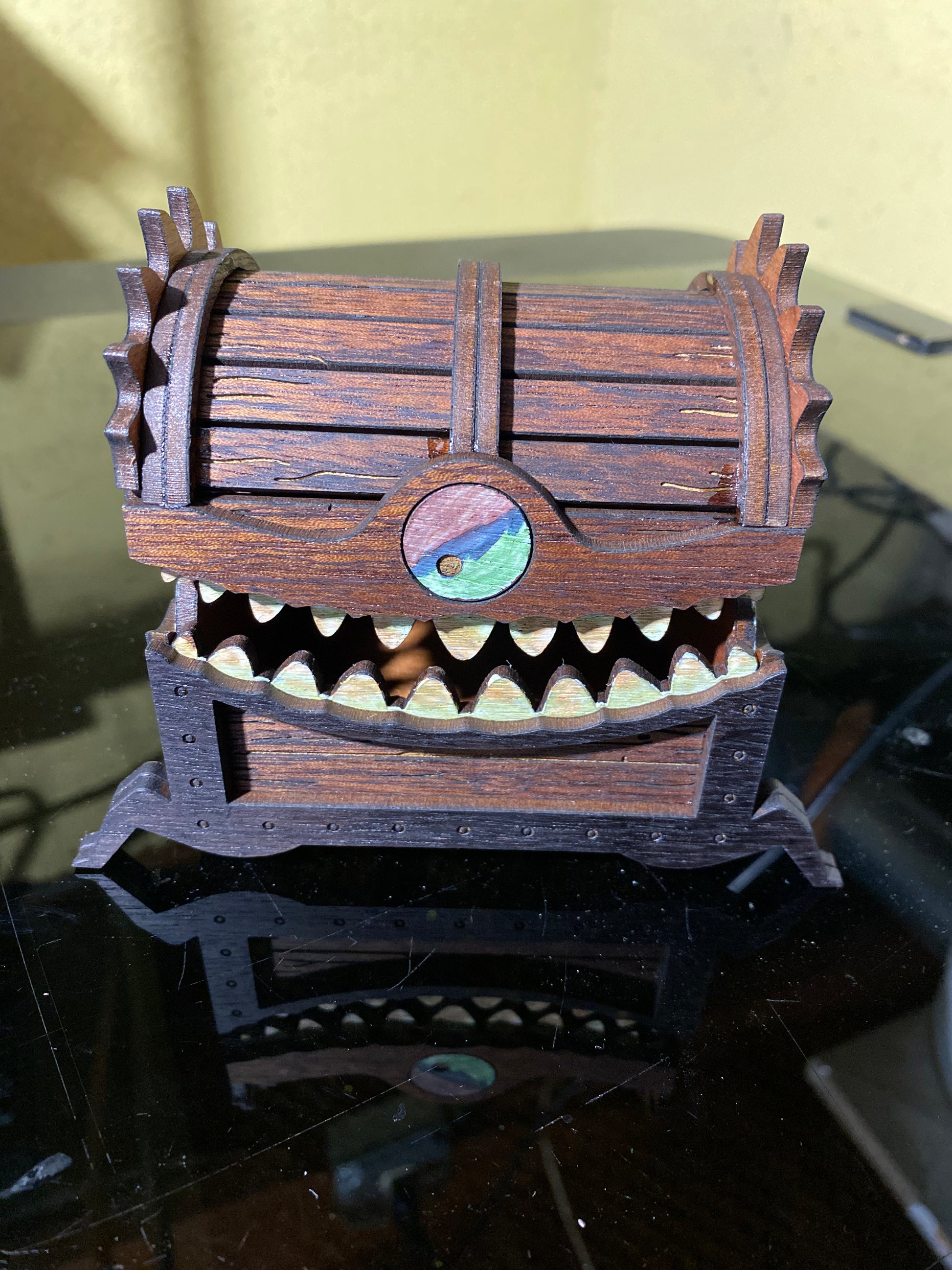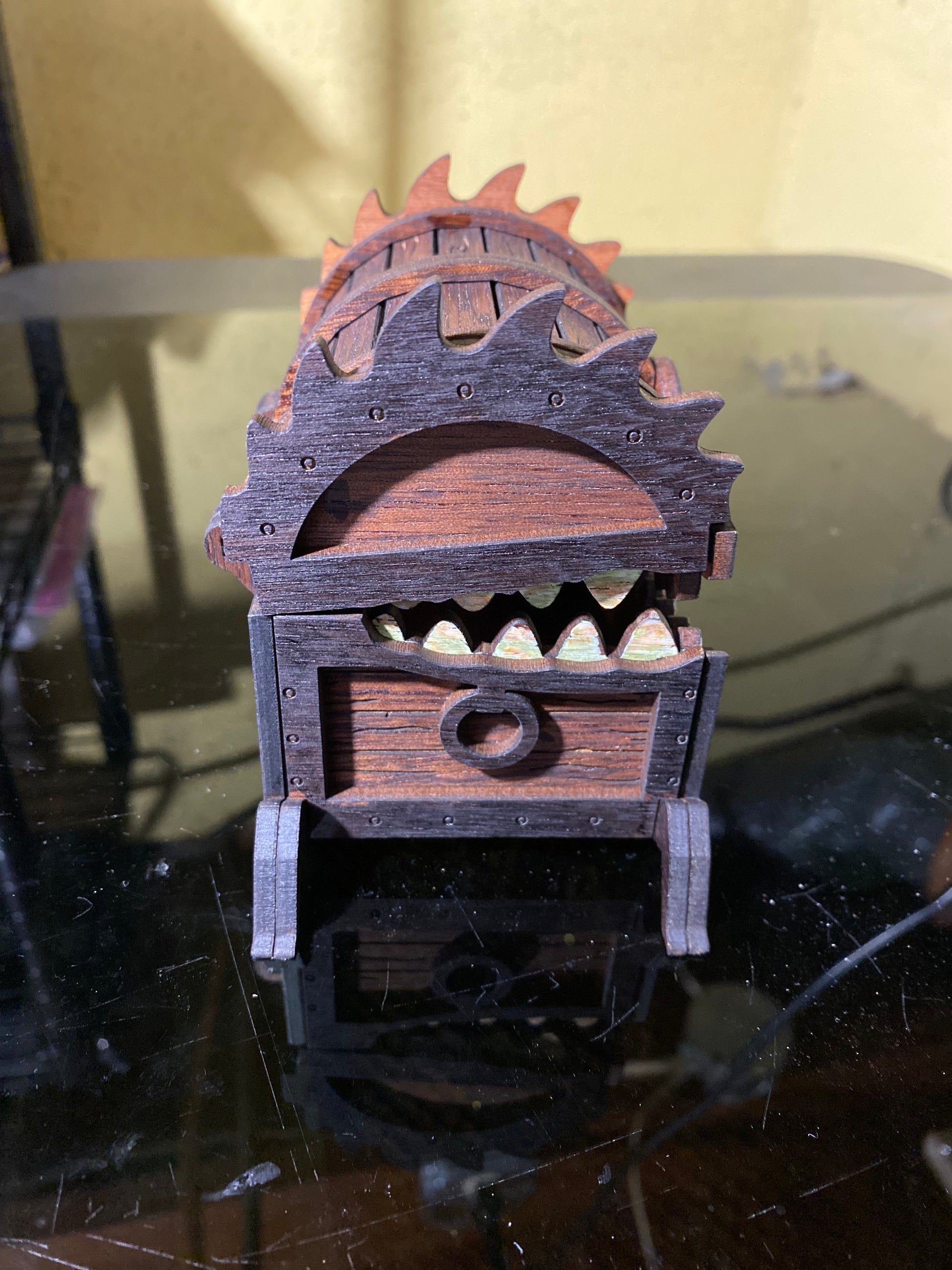 This creepy and yet wonderful chest of holding can hold your dice collection, a miniature or two, or whatever your character may find in a time of need. Made from hardwood veneer plywood - sapele, cherry, alder, mahogany, or cedar - we have options to make this one of a kind to fit your character. The wood will be randomly chosen by our fabricator based upon what current stock levels we have available.