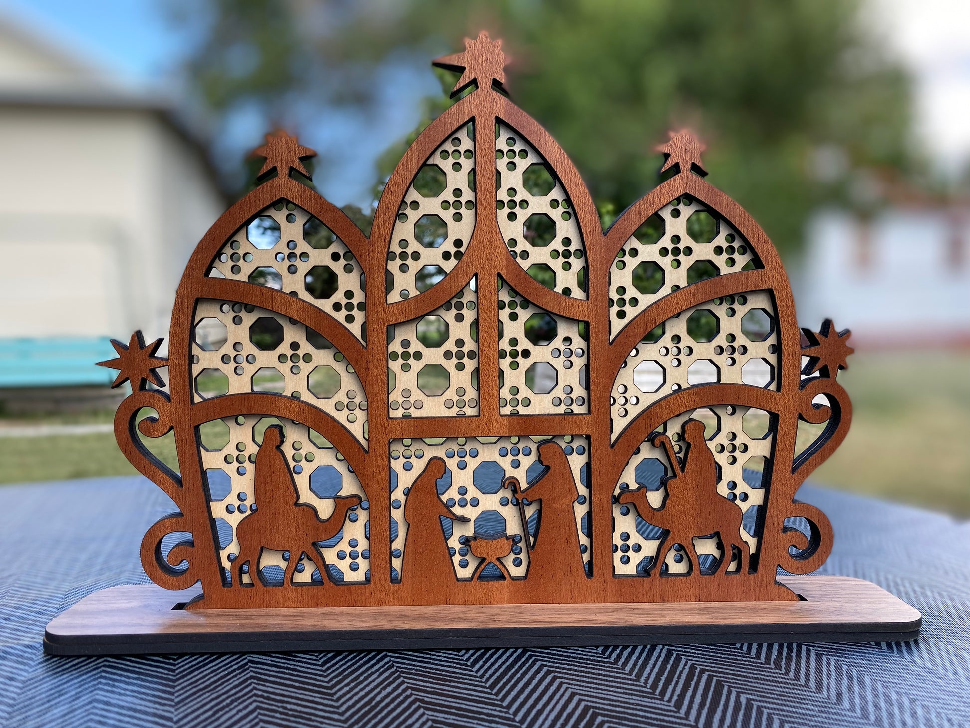 Two layer maple and walnut veneered wood, with semi-gloss or satin finish, with walnut stand for display on your table, desk or mantle.